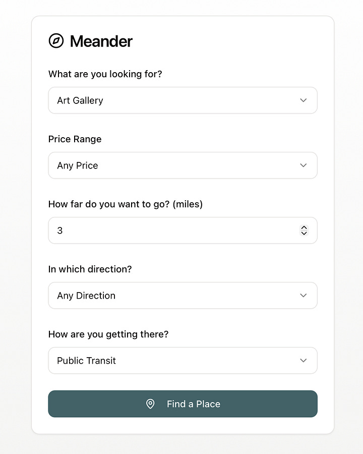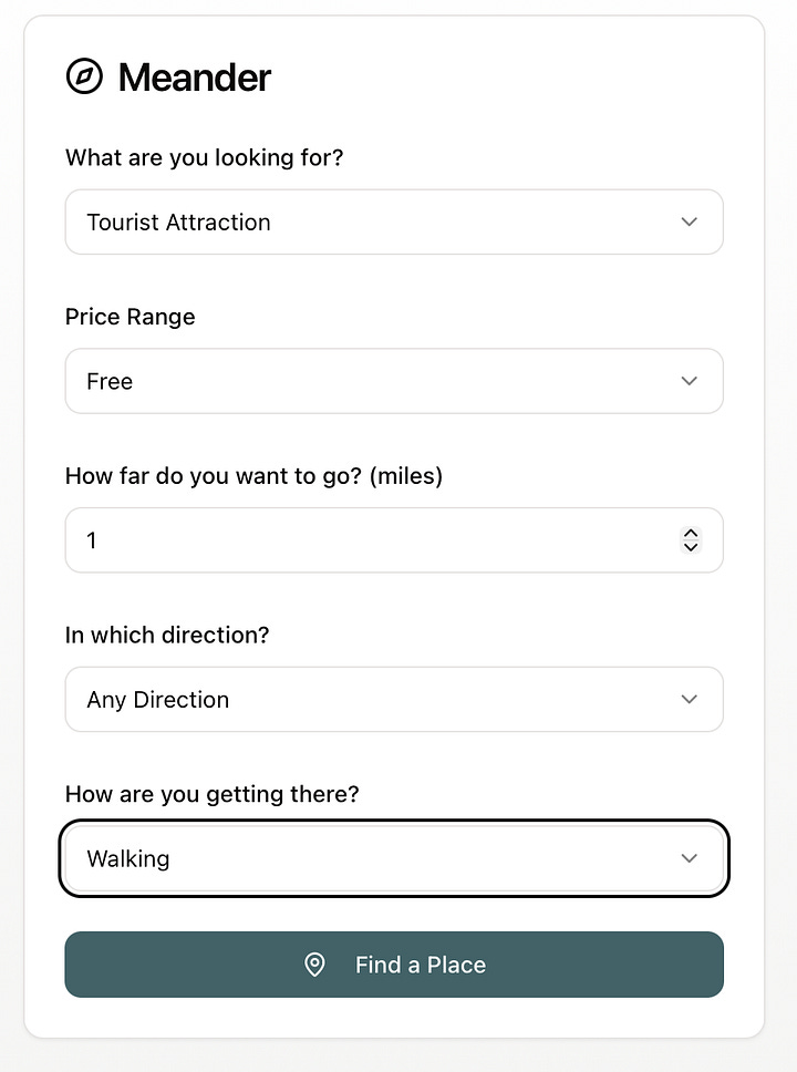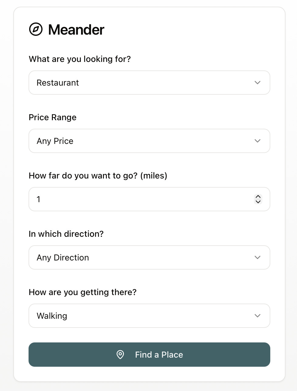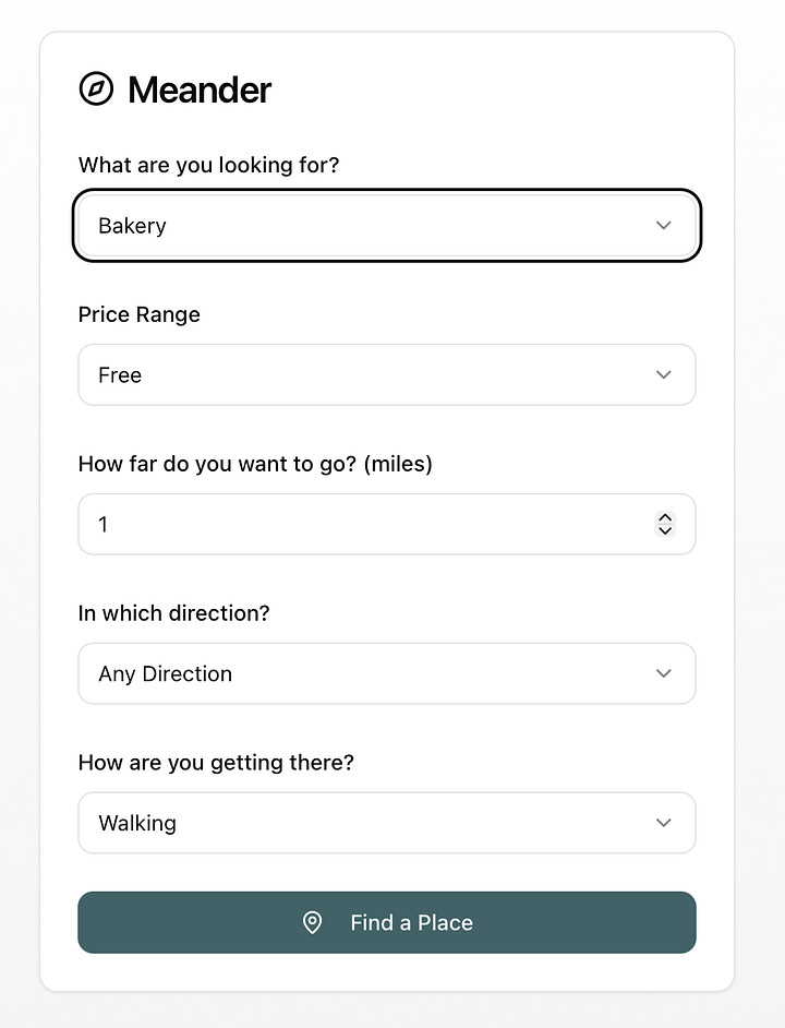 A few notes. I'm using Google's data, so however Google classifies the place, whether correctly or incorrectly, is how it'll get classified here. Second, the distance input is a radius so it’ll find somewhere in any direction within the given distance. In the future I'd like to add some kind of cardinal directionality. Third, I built it to specifically avoid seeing any information about the destination. No names, reviews, or any other data upfront that could affect my opinions - I want as much surprise as possible.